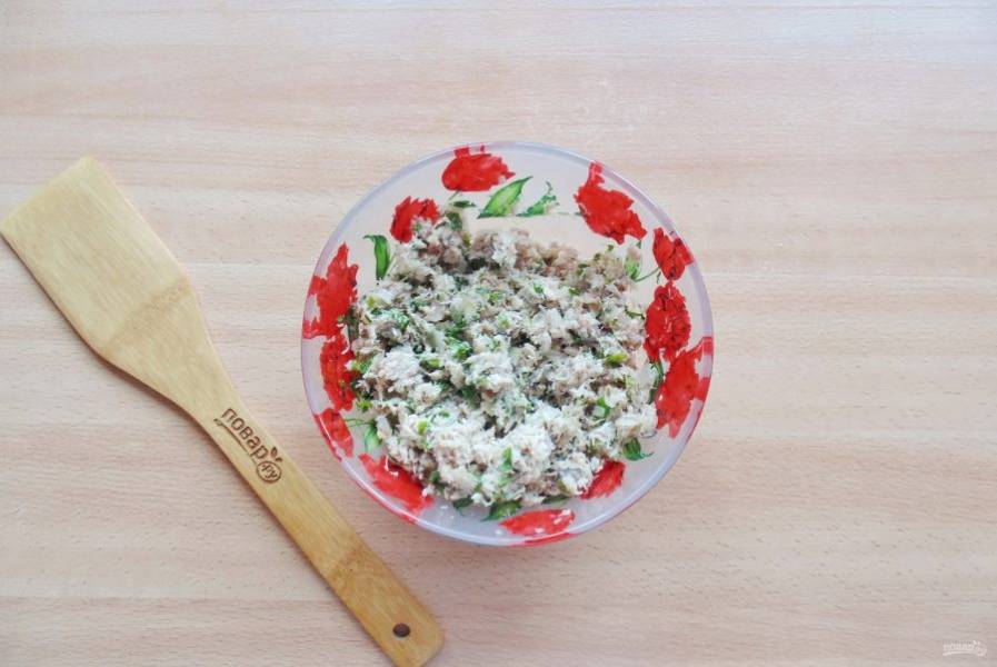 Выложите на тесто начинку из курицы с луком и петрушкой.