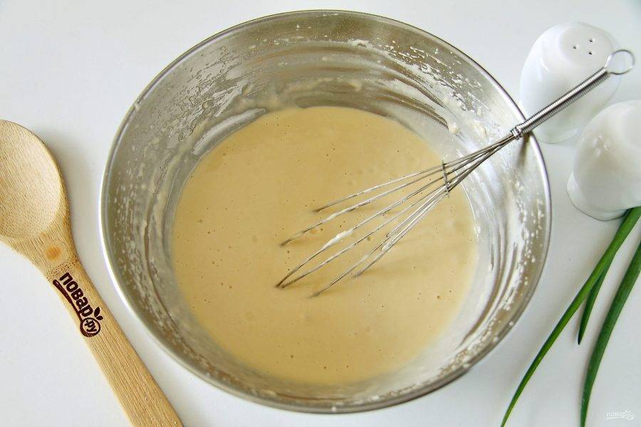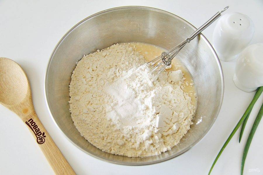 Начинка готова. Теперь приготовьте тесто. В глубокой посуде взбейте яйца с 0.5 ч.л. соли.