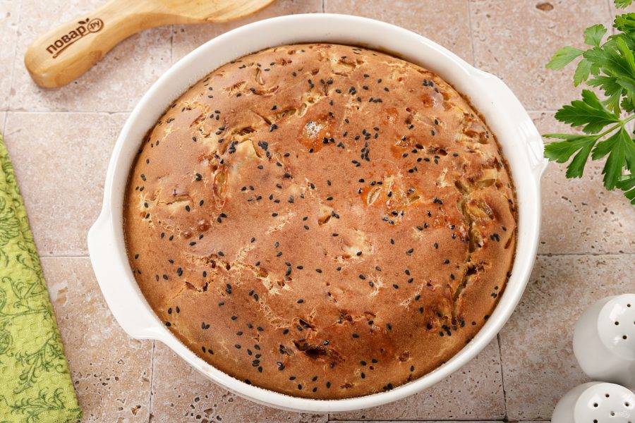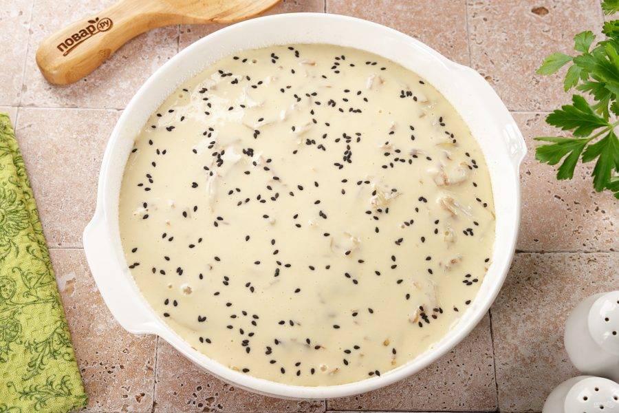 Затем сверху залейте остатки теста, осторожно распределите его, чтобы вся поверхность пирога была покрыта. Мягкое тесто пропитает вкусную начинку, соединив все компоненты между собой. Верх можно посыпать кунжутом.