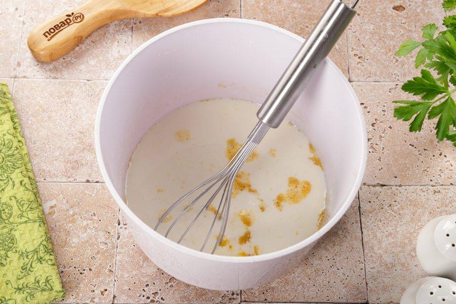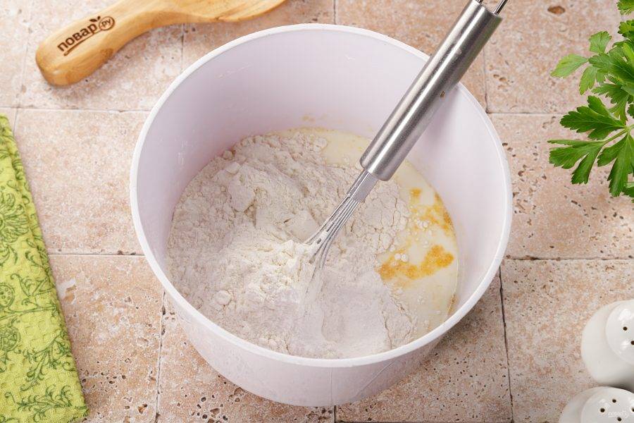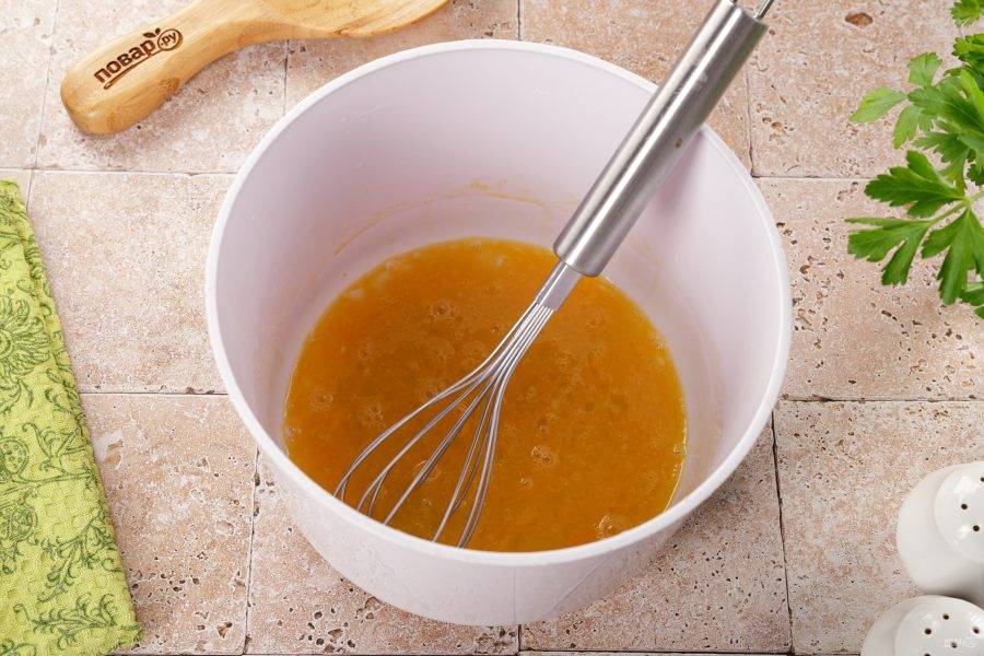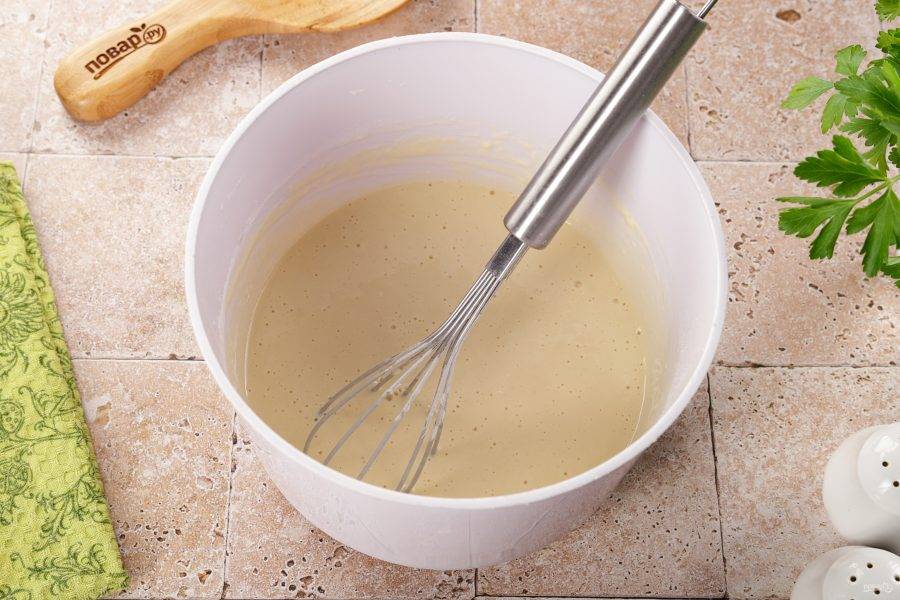 Перемешайте всё до однородного состояния. Заливное тесто должно быть гладким, но не густым, а тягучим, как на оладьи.