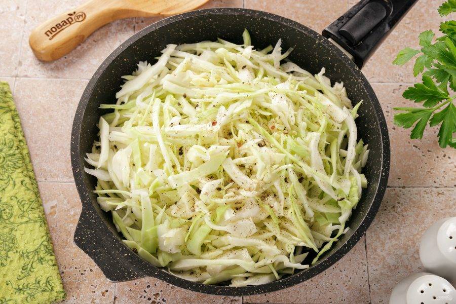 Капусту тонко нашинкуйте и переложите на разогретую сковороду с маслом. Добавьте по вкусу соль и молотый перец.