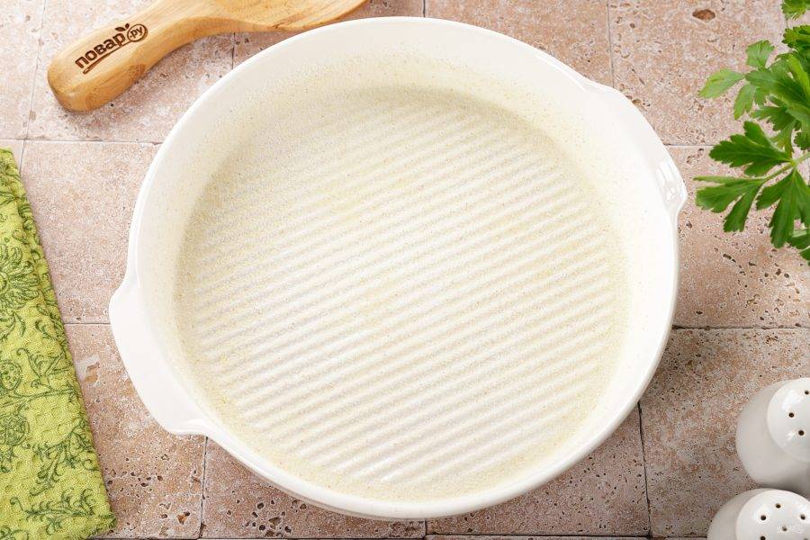 Жаропрочную форму с бортиками смажьте маслом. Дно и бока присыпьте мукой или манкой.