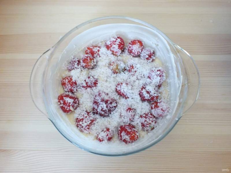 Сверху залейте 1/2 частью теста, выложите опять клубнику, присыпьте кокосовой стружкой.