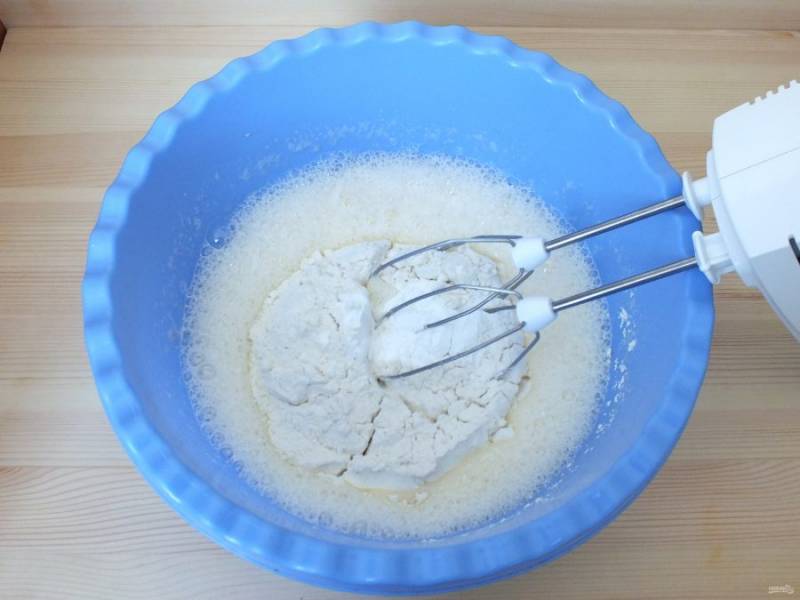 Всыпьте муку и разрыхлитель для теста. Хорошо размешайте на малых оборотах.
