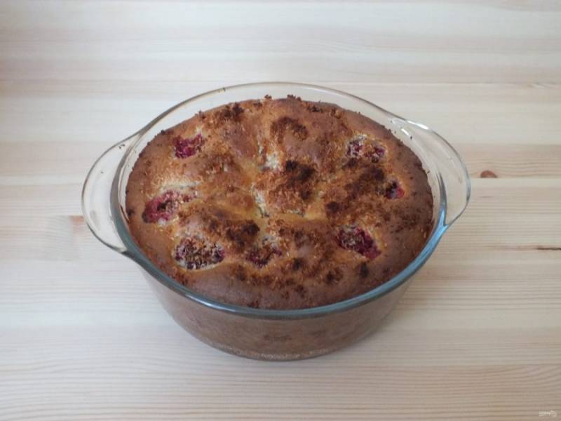 Вылейте оставшееся тесто, разложите остатки клубники и кокосовой стружки. Поставьте выпекаться на 50 минут. Если во время выпечки верх пирога зарумянится, прикройте его пергаментом или фольгой и выпекайте до готовности.