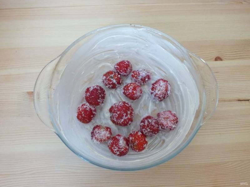Чистую, подготовленную клубнику смешайте с кокосовой стружкой.