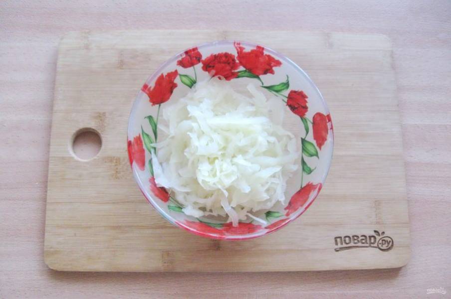 Приготовьте начинку для пирога. Капусту нарежьте соломкой и отварите до мягкости. Воду слейте.