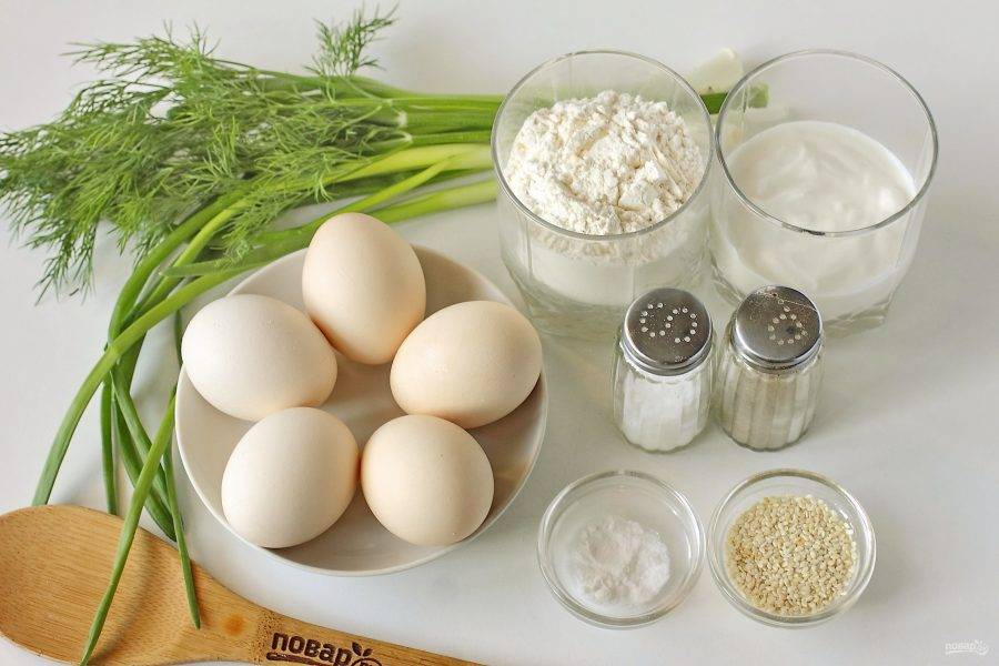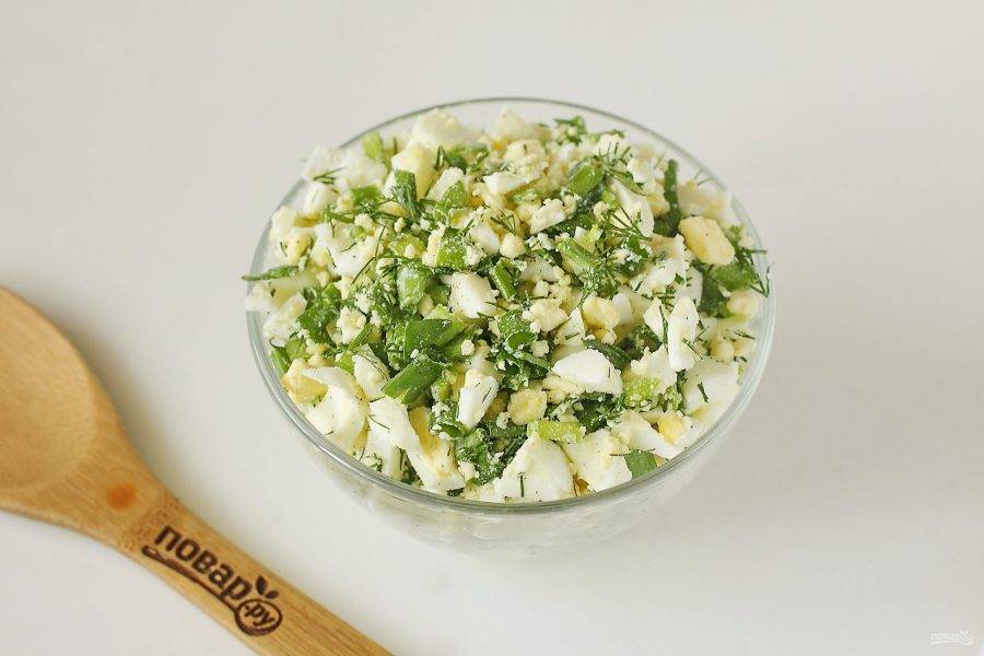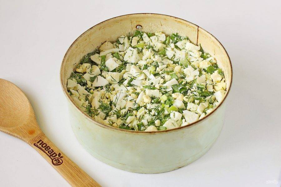 Для начинки соедините нарезанные кубиками вареные яйца и рубленую зелень. Соль и перец добавьте по вкусу.