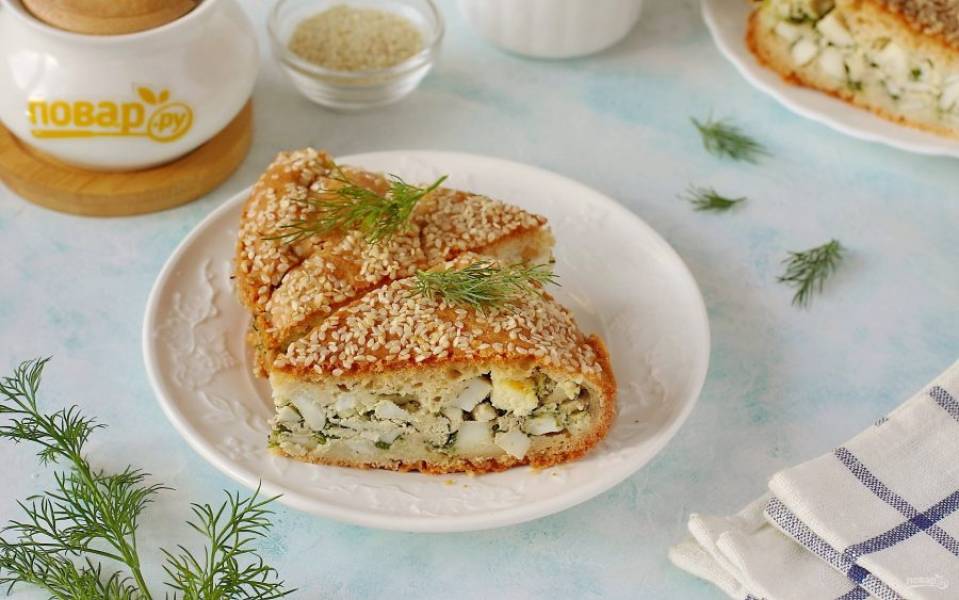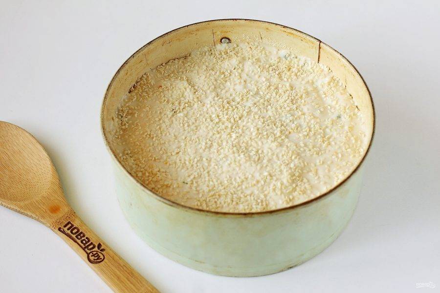 Полейте начинку оставшимся тестом и посыпьте сверху кунжутом. Выпекайте в духовке при температуре 180 градусов около 30 минут.