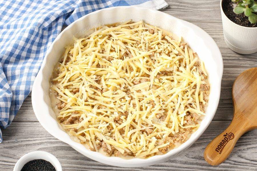 Сверху полейте оставшимся тестом и посыпьте кунжутом. Выпекайте в духовке при температуре 180 градусов около 30-40 минут. Верх должен подрумяниться.