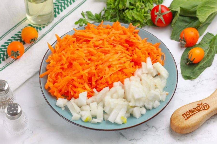 Морковь и лук очистите от кожуры и промойте в воде. Натрите морковь на терке с мелкими ячейками, а лук нарежьте кубиком.