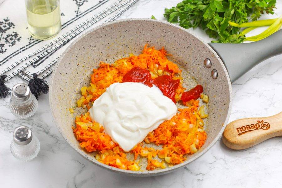 Затем добавьте томатную пасту и сметану, посолите и поперчите массу. Поджарьте 1-2 минуты.