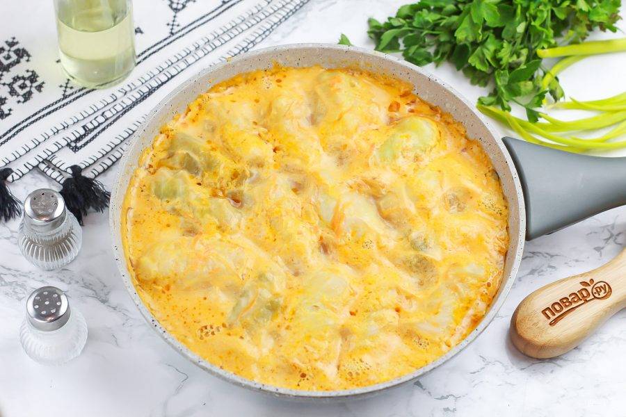 Выложите замороженные голубцы в заливку, накройте сковороду крышкой и тушите на умеренном нагреве голубцы примерно 15-20 минут в зависимости от их величины.