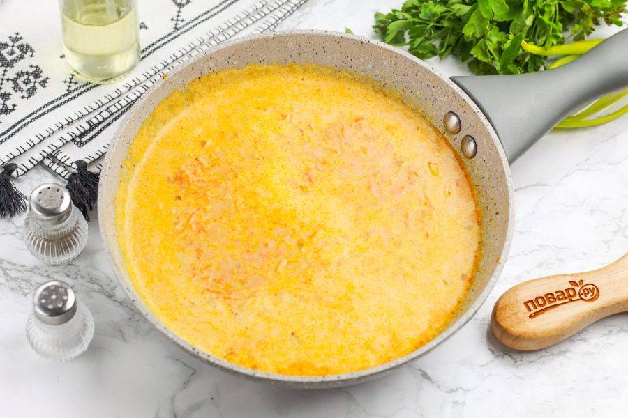 Нарежьте луковицу мелкими кубиками, а морковь натрите на терке с мелкими ячейками. Прогрейте растительное масло в сковороде и выложите в емкость все нарезки. Обжарьте в течение 3-4 минут до румяности.