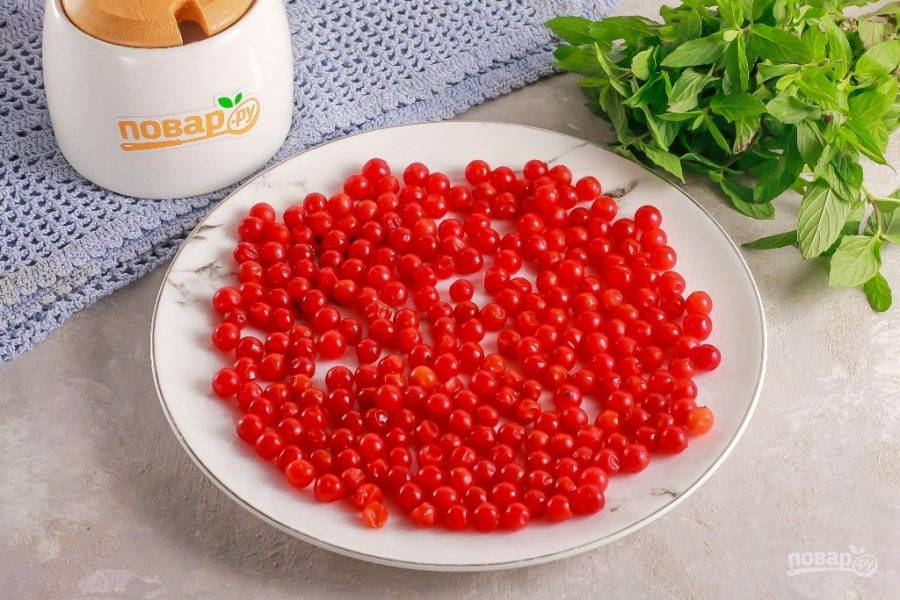 Оборвите ягодки с гроздьев и высыпьте их в глубокую емкость. Влейте воду и промойте ягоды несколько раз. Затем откиньте их на дуршлаг.