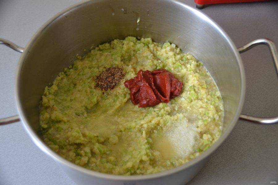 Прокрутите на мясорубке кабачки и лук, добавьте соль, сахар, смесь перцев и томатную пасту, тушите до готовности на небольшом огне, в моем случае это 1,5 часа, в конце тушения добавьте 2 чайных ложки столового уксуса.