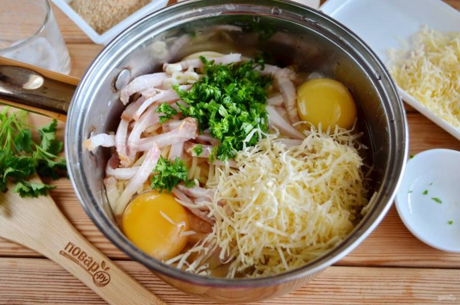 Добавьте сливки, сырые яйца, бекон, зелень, половину сыра.
