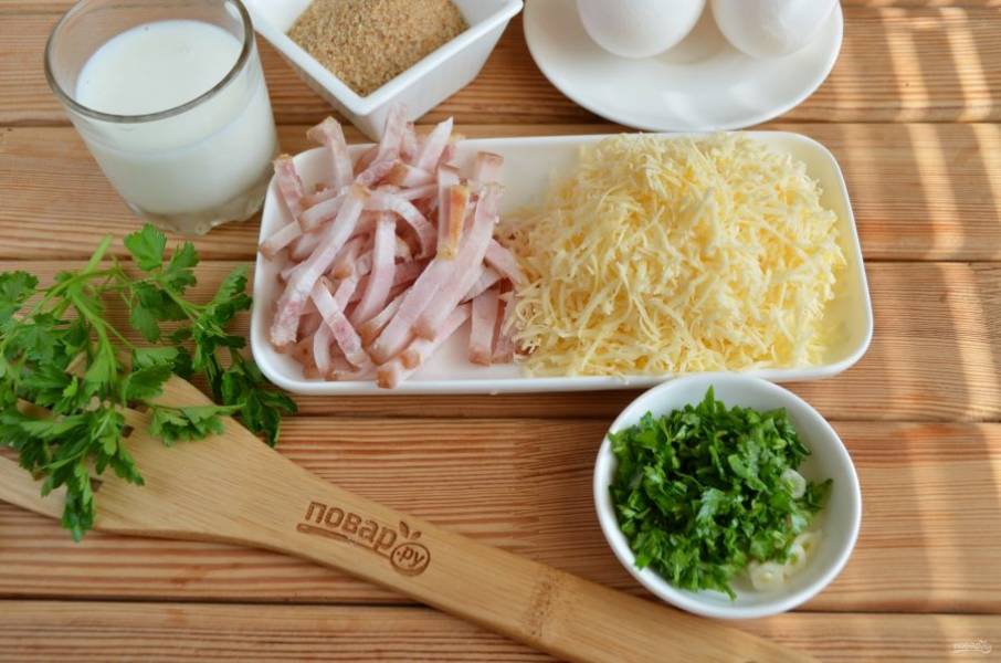 Пока закипает вода порежьте бекон тонкой соломкой или кубиками, сыр натрите на терке, порубите мелко зелень.