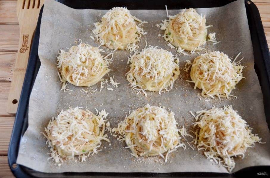 Сверху посыпьте тертым сыром. Отправьте в духовку на 12-15 минут, температура 200 градусов.