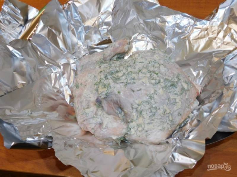 Затем курочку заверните в фольгу и поставьте в духовку при 200С на час. Затем фольгу снимите и оставьте в духовке еще на полчаса, чтобы курочка подрумянилась.