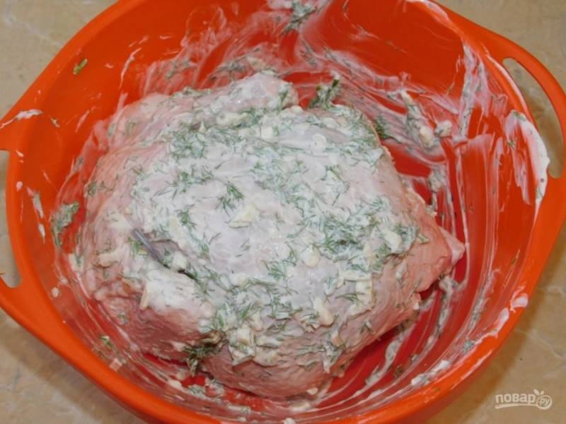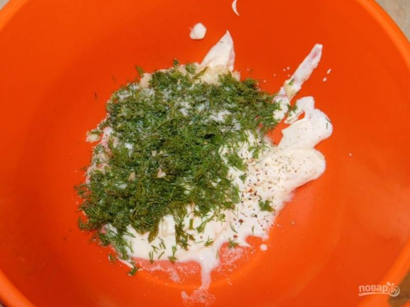 Смешайте чеснок и укроп со сметаной. Добавьте соль и специи.