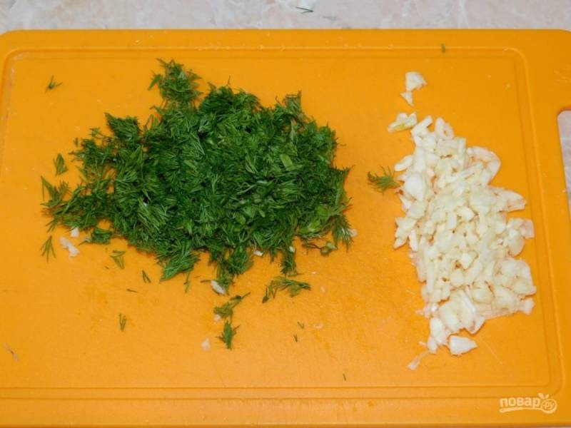 Чеснок почистите и измельчите. Укроп мелко нарежьте.