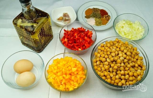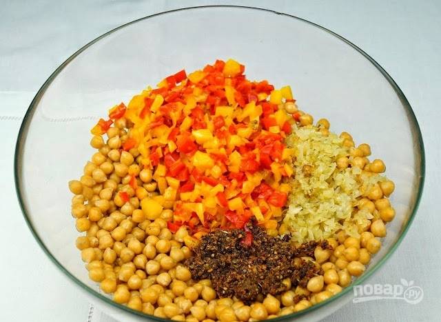 1. Нут отварите в подсоленной воде до готовности. Очистите овощи и измельчите. Обжарьте в небольшом количестве масла лук с чесноком и специями. Отдельно до мягкости обжарьте сладкий перец.