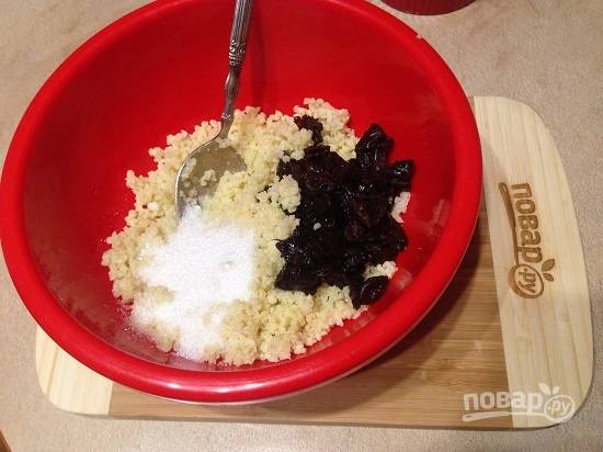 6. Пшенную кашу перемешиваем с черносливом, нарезанным на кусочки, сахаром обычным и ванильным.