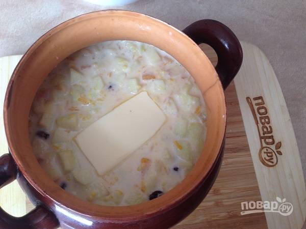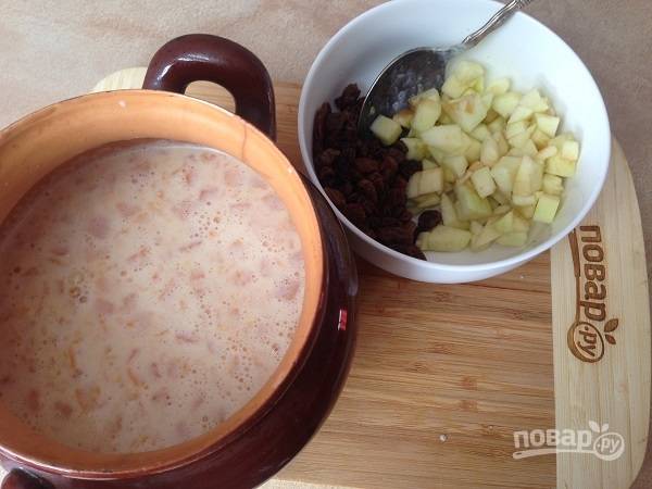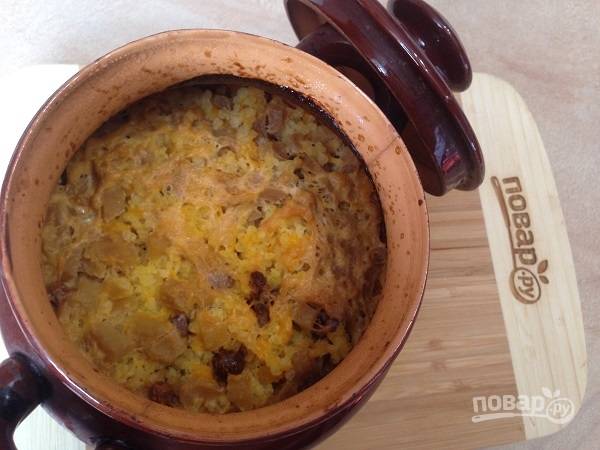 7. Перекладываем пшено с тыквой в горшочек, добавляем яблоко и изюм, перемешаем.