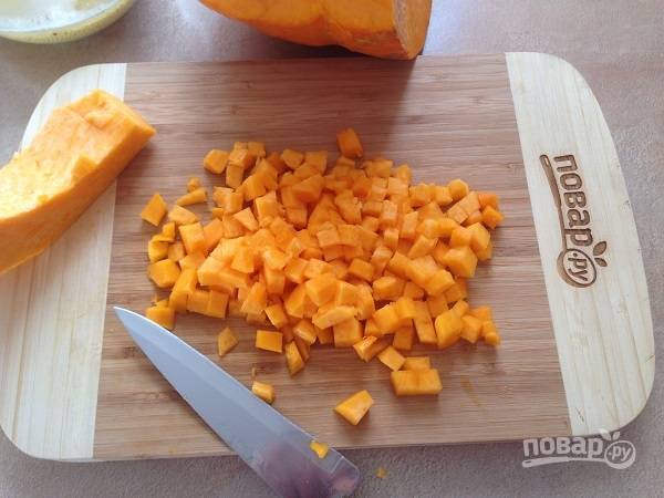 2. Тыкву очистим и нарежем кубиками: можно покрупнее, можно помельче, это зависит только от вас.