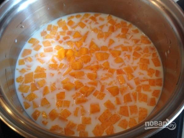 3. Отправляем тыкву в закипевшее молоко, добавим соль и сахар. Варим минут 5.