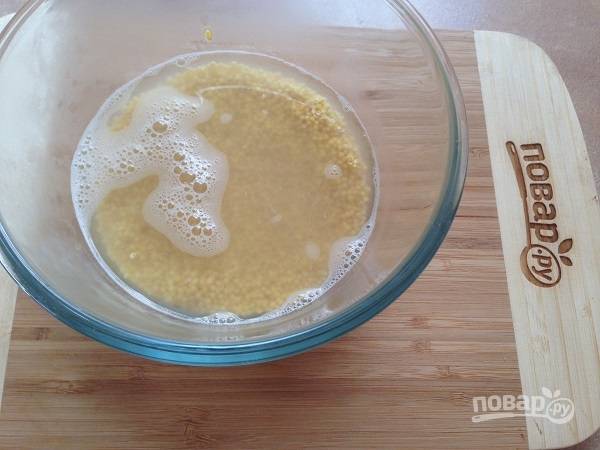 1. Ставим молоко на огонь, а пока заливаем пшено кипятком минут на 8-10. Таким образом мы уберем возможную горечь из крупы. Затем пшено аккуратно промываем проточной водой.