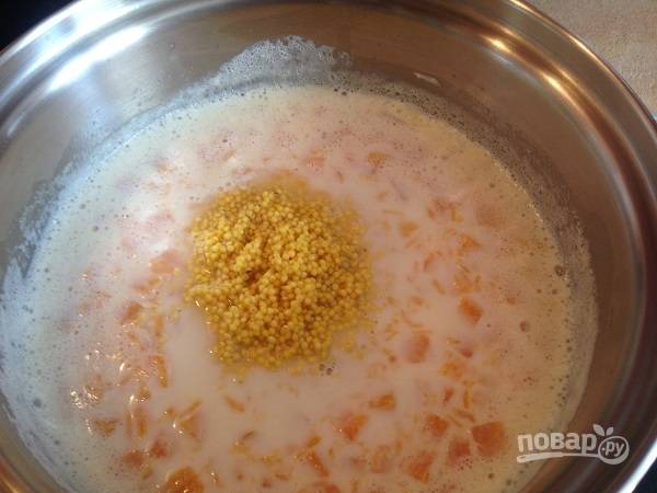 4. Добавим к уже слегка мягкой тыкве пшено. Варим минут 10.
