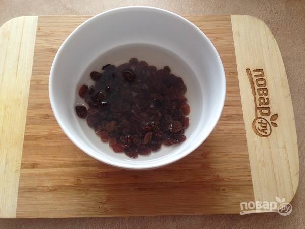 5. Изюм заливаем кипятком на пару минут, затем сцедим жидкость и отжимаем изюм.