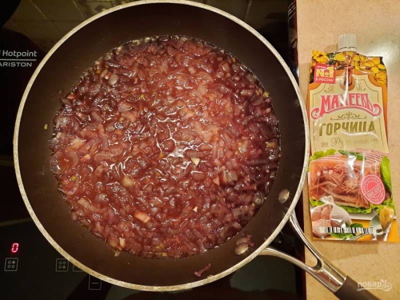 Минут за 20 до окончания второго часа запекания приготовьте заправку. Обжарьте на растительном масле порезанный лук и чеснок до прозрачности и мягкости. Влейте вино, доведите до кипения и дайте немного выпариться.