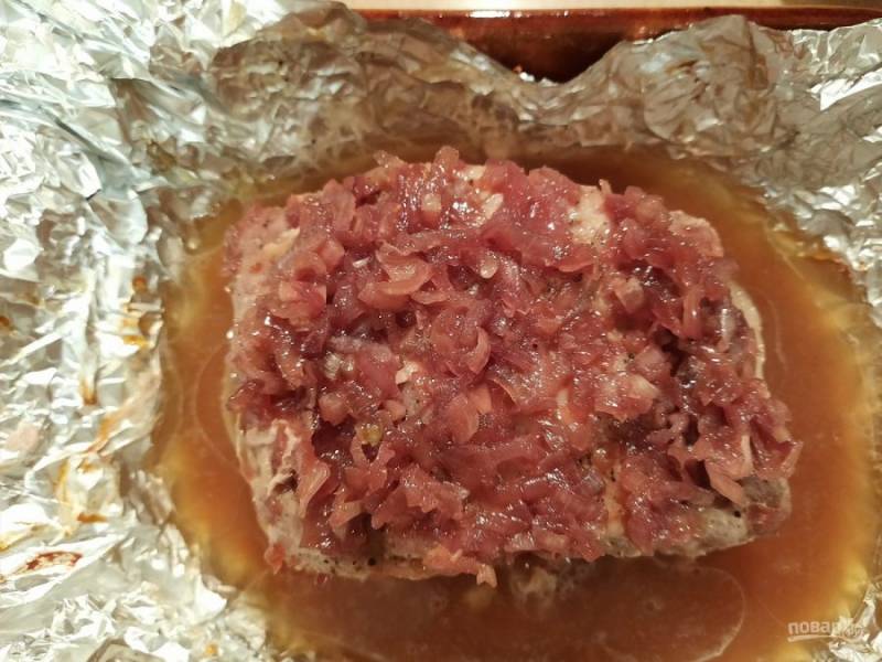 Достаньте мясо из духовки. Выложите лук и полейте глазурью. Накройте фольгой и запекайте ещё 20 минут. Снова достаньте, полейте глазурью и в духовку ещё на 20 минут. На третий раз мясо снова поливаем глазурью, но теперь оставляем открытым, даем глазури схватиться. Даем мясу отдохнуть 5-10 минут. Вкуснейшее мясо подаем с овощами, легким гарниром, вином и кетчупом "МахеевЪ".
