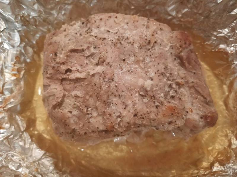 Свинину натереть солью и перцем со всех сторон, завернуть в фольгу и поставить в духовку на два часа при температуре 150 градусов.