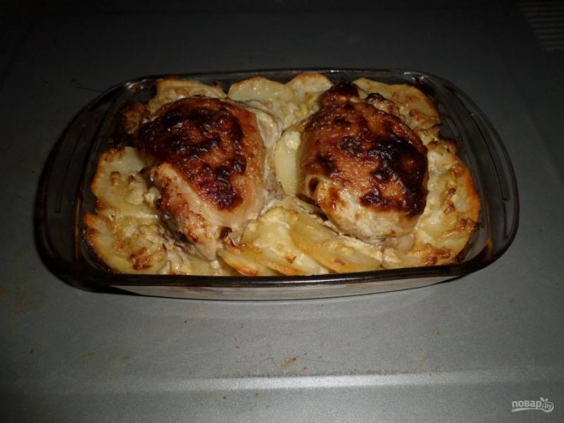 В глубокую форму выкладываем овощи с майонезом. Поверх овощей выкладываем замаринованные куриные бедра. Помещаем глубокую форму в разогретую духовку.