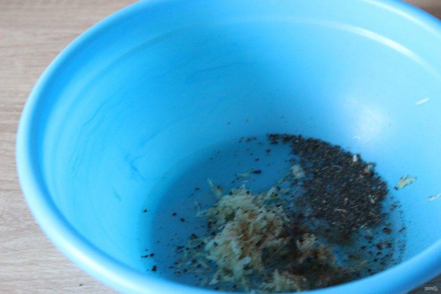 Чеснок мелко нарезать. Добавить острый и черный перцы, базилик.