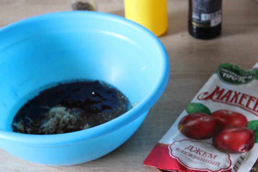 Добавить растительное масло, соевый соус, клюквенный джем, лимонный сок.