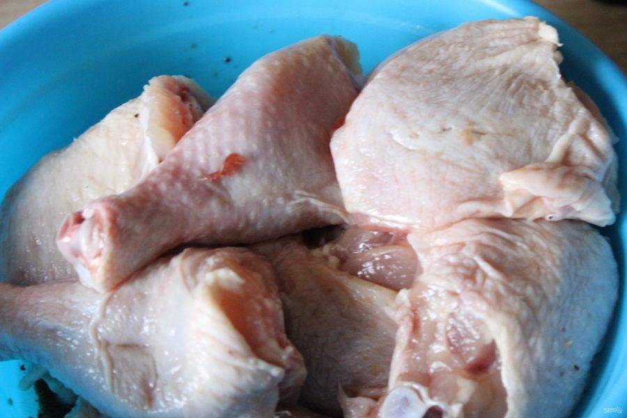 Куриные окорочка разрезать на две части. Сложить в посуду с маринадом.