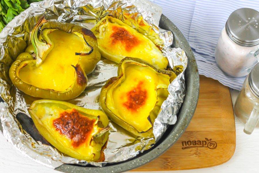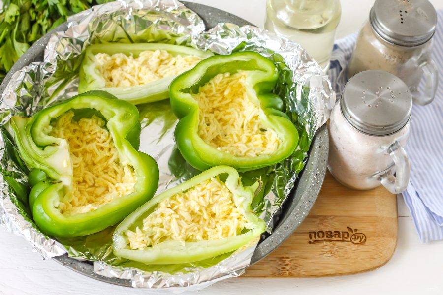 Выложите начинку в лодочки из перца. Разогрейте духовку до 200 градусов и поместите в нее форму.