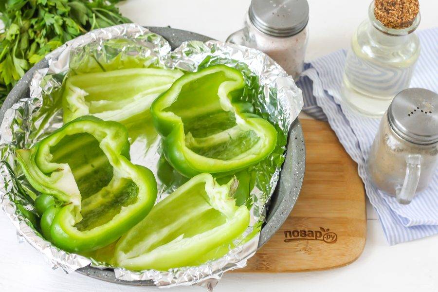 Болгарские перцы разрежьте вертикально на две половинки и удалите семена. Промойте каждую из них в воде и обсушите бумажным полотенцем. Форму смажьте растительным маслом и выложите в нее овощи.
