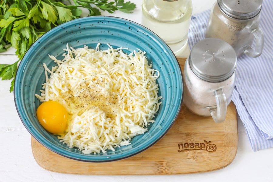 Фету натрите на терке с мелкими ячейками в глубокую емкость. Попробуйте сыр на вкус, при необходимости присолите. Вбейте туда же куриное яйцо и все перемешайте.