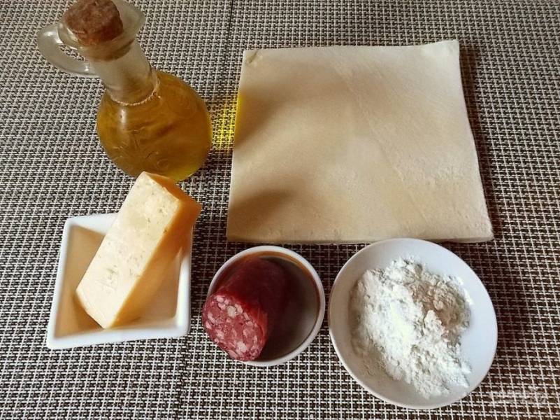 Натрите на крупной терке сыр и колбасу. Порежьте тесто квадратиками 1*1 см.