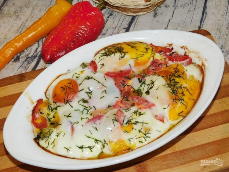 Вбейте яйца и немного посолите. Посыпьте укропом. Поставьте в духовку, разогретую до 200 градусов на 30 минут. Накрывать крышкой не нужно.