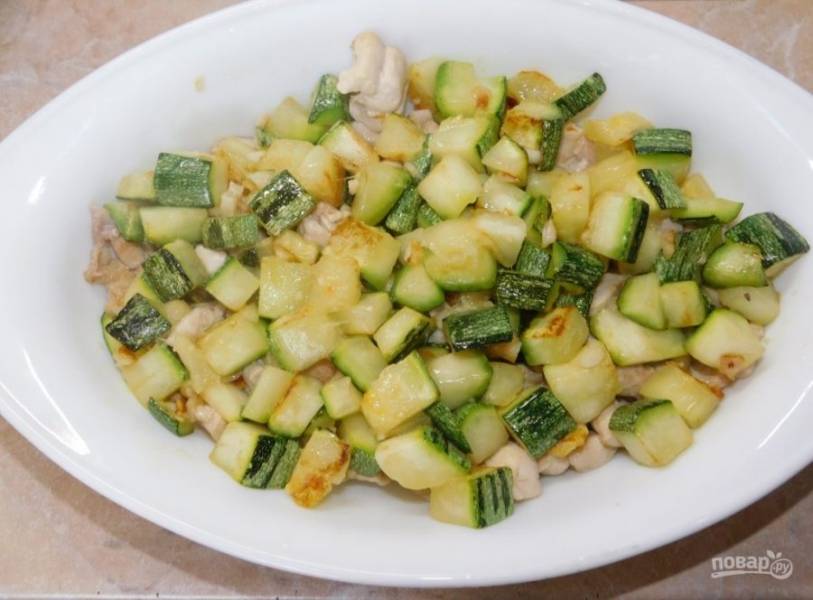 Отдельно обжарьте кабачки с чесноком. Выложите на куриное мясо вторым слоем. Посолите.