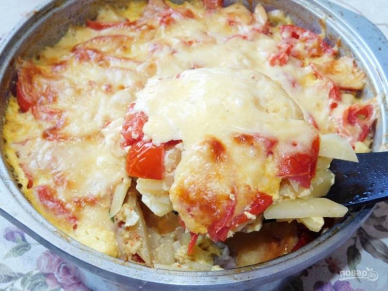 Залейте яичной смесью картофель с мясом и посыпьте сверху тертым сыром. Накройте крышкой. Поставьте в духовку, разогретую до 220 градусов на 50 минут.