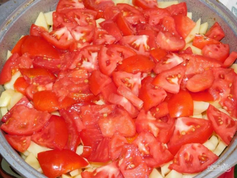 Следующим слоем выложите картофель, нарезанный соломкой.