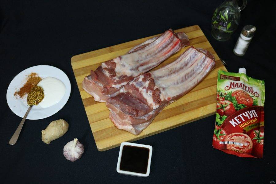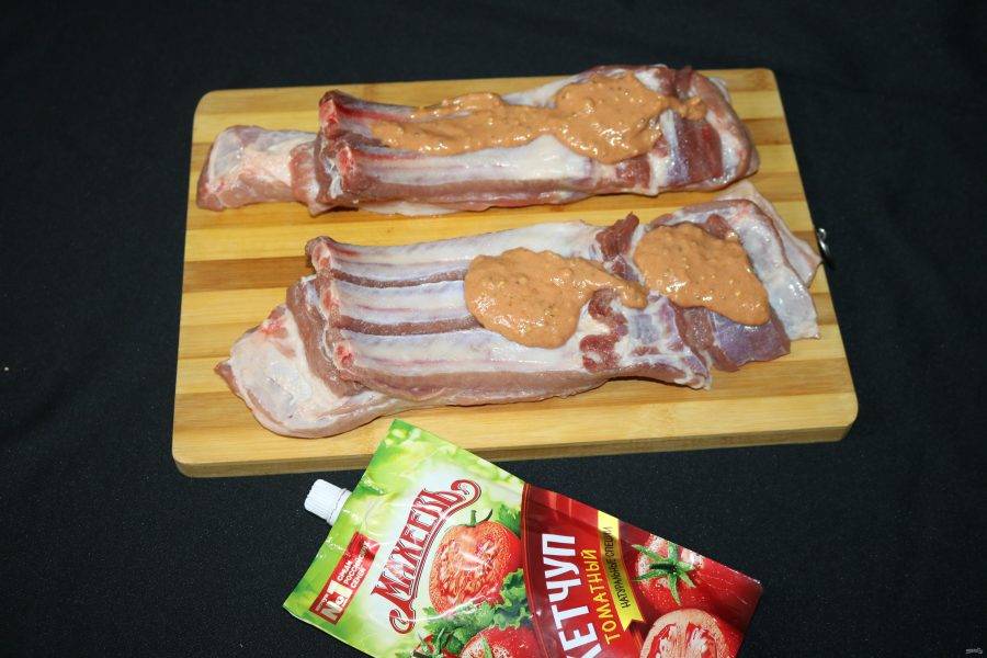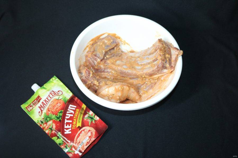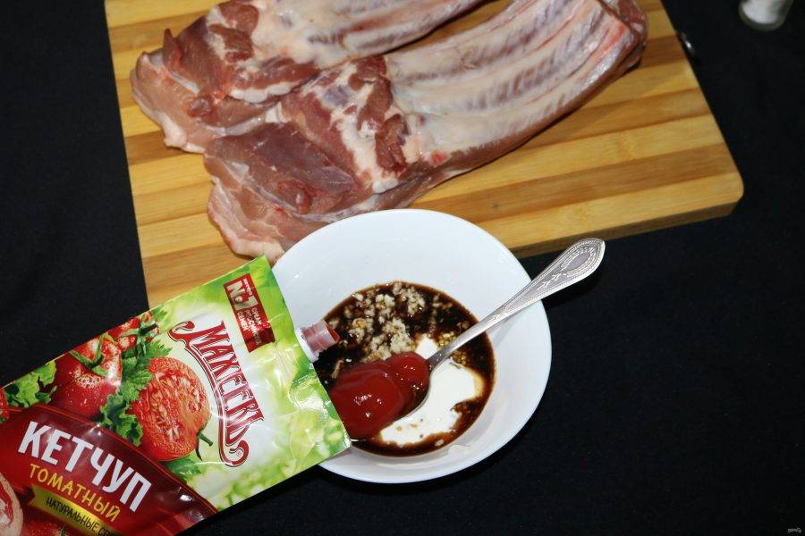 Подготовьте маринад. Соедините измельчённый чеснок, соевый соус, сметану,горчицу в зёрнах, небольшое количество тёртого имбиря, масло, соль, специи и кетчуп "Махеевъ" томатный.